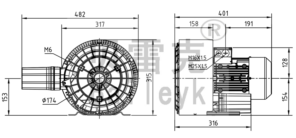 最大風量:150m3/h 最大正壓:280mbar 最大負壓:280mbar 防護等級:IP55 噪音:66db 重量:25Kg
